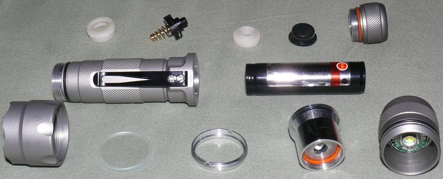 In normal use, all you'll need to worry about is unscrewing the tailcap, which consists of all the parts in the back (top) row, and replacing the battery. The pictured level of disassembly is unecessary and discouraged in the field.